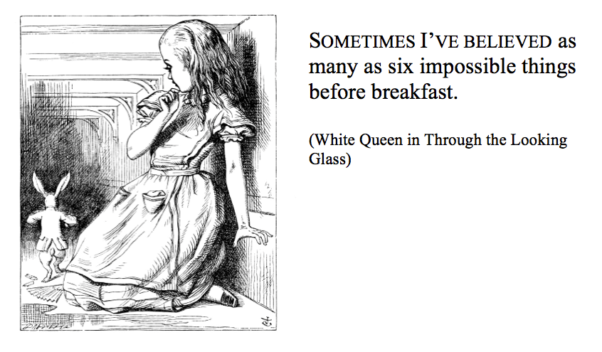 #042: Verzoeknummerweek! Vandaag het verzoek om een quote te nemen uit een boek, waarover gediscussieerd kan worden. Ik vond het lastig om een goede te vinden, maar deze vond ik wel inspirerend, door Lewis Carroll, uit Through the Looking Glass. Ik ga dus niet teveel zeggen, je mag alle kanten op met je gedachten: weet je zes onmogelijke dingen? Heeft het zin om zes onmogelijke dingen te bedenken? Vind je het een leuke quote waar je wat mee kan? Natuurlijk mag je ook suggesties doen voor andere quotes.