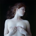 Another photographer who works with the reality of women is Carla van de Puttelaar. In her work she portrays the female nude as it is, without using Photoshop. This means that she deliberately shows little scratches, moles, goose bumps and everything else the skin shows. These are exactly the things that are always wiped away in magazines, and which according to Van de Puttelaar reveal the true human beauty.[17] She places women against a black background, and mostly they have their eyes closed so they seem to be in their own world. Although she doesn’t change a thing after developing the photos, she does something while developing the pictures, to give the photos a cool and soft glance. About this she says: “That developed gradually. (…) I never liked harsh, very vivid colors, but I also wanted to avoid the trap of false romance. I liked the paleness of the skin and wanted to increase it. This also enables me to give greater contrast to skin’s small marks and sensations.” So she tempers with the outcome of the picture to make it more intense. What is also visible in her work, is her interest in the work of Dutch old masters, especially Lucas Cranach the Elder.[18] So although Van de Puttelaar stages the model and uses a technique to change the feel of the outcome, she refers very directly to the reality of the woman, and the rich history of portraying people.